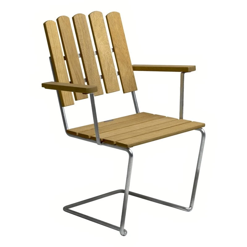 Grythyttan Stålmöblerin nojatuoli A2 on tuonut ruotsalaisen muotoilun laatua pihoille, parvekkeille ja terasseille aina 1930-luvulta alkaen – itse asiassa ruotsalaisyrityksen menestystarina sai alkunsa juuri tämän tuolin siivittämänä. Artur Lindqvistin suunnitteleman pinottavan puutarhatuolin erityispiirre on sen taivutetusta teräsputkesta valmistettu siro jalkarakenne, jonka ansiosta tuolilla on miellyttävä, aavistuksen keinuva istuintuntuma. Vastaava jalkarakenne on tuttu monesta muustakin Grythyttan Stålmöblerin tuolista. Ajan myötä galvanoidut teräsosat saavat ylleen himmeän mattapinnan, kun taas säännöllisesti öljyttyinä tammipuiset osat säilyttävät lämpimän sävynsä pitkään.