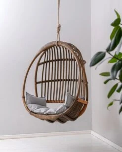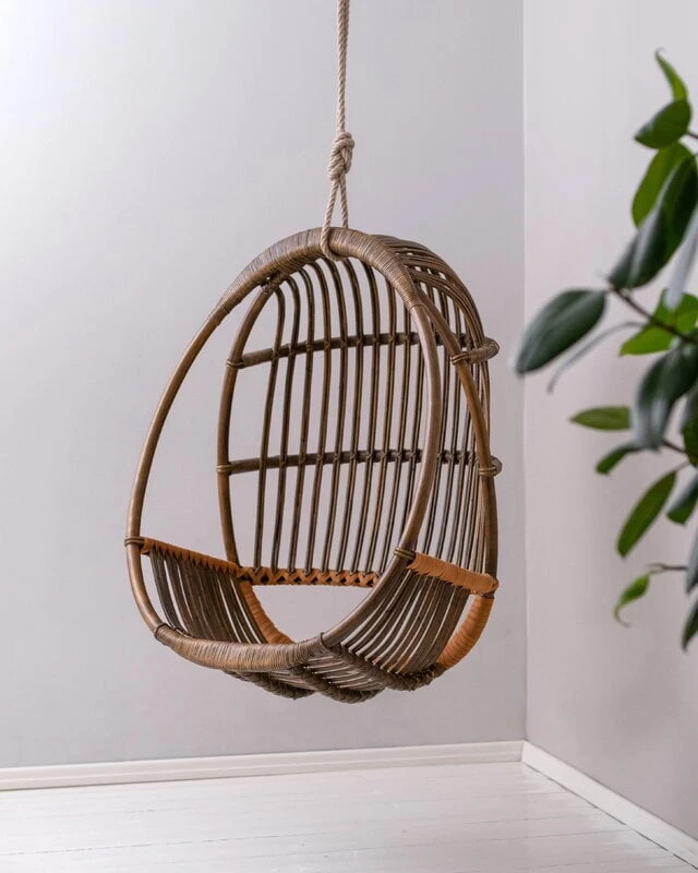 Itse riippukeinun materiaali on tietysti rottinki. Kyseessä on trooppinen puulaji, joten Sirkka viihtyy parhaiten tiloissa, joissa ilmankosteus on korkeahko. Jos kotona on kovin kuiva ilma, voi kosteutta lisätä ilmankostuttimella tai suihkimalla hieman vettä ilmaan rottinkikalusteen lähellä – pidäthän kuitenkin huolen, ettei rottinki tai nahka pääse kastumaan. Koneellinen ilmanvaihto tai lähellä sijaitseva lämpöpatteri saattavat kuivattaa ja sitä myötä haurastuttaa rottinkia.