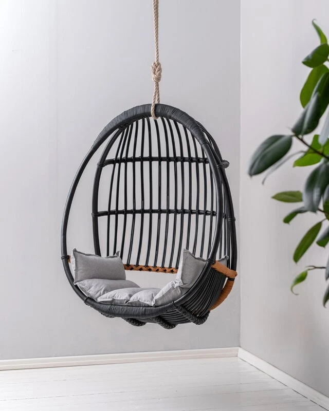 Itse riippukeinun materiaali on tietysti rottinki. Kyseessä on trooppinen puulaji, joten Sirkka viihtyy parhaiten tiloissa, joissa ilmankosteus on korkeahko. Jos kotona on kovin kuiva ilma, voi kosteutta lisätä ilmankostuttimella tai suihkimalla hieman vettä ilmaan rottinkikalusteen lähellä – pidäthän kuitenkin huolen, ettei rottinki tai nahka pääse kastumaan. Koneellinen ilmanvaihto tai lähellä sijaitseva lämpöpatteri saattavat kuivattaa ja sitä myötä haurastuttaa rottinkia.