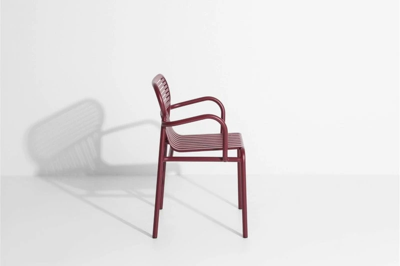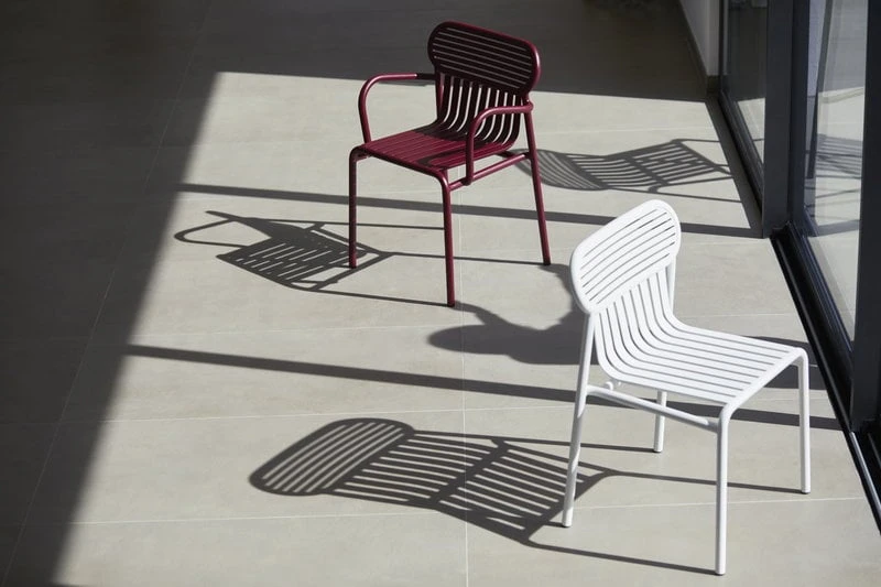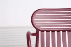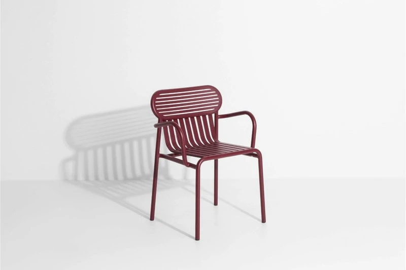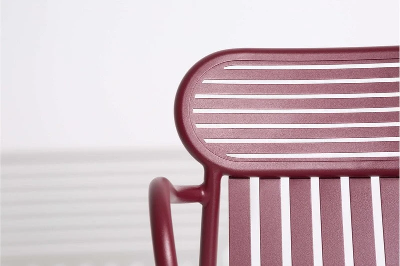 Käsinojallinen Week-end-tuoli on osa ranskalaisen Petite Frituren alumiinisten ulkokalusteiden kokoelmaa. Viehättävien Weekend-tuolien tunnistettavimpiin piirteisiin kuuluvat niiden selkänojien ovaalinmuotoiset yksityiskohdat sekä vaaka- ja pystysuorien linjojen vuorottelu. Kaikki kokoelman tuolit ovat pinottavia.