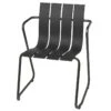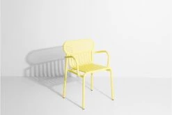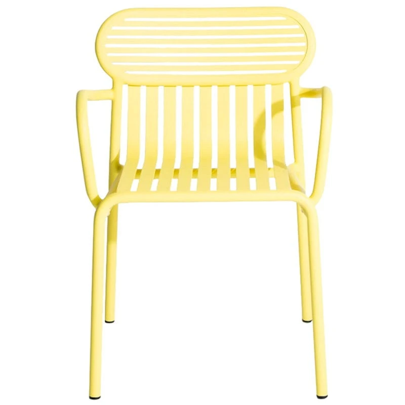 Käsinojallinen Week-end-tuoli on osa ranskalaisen Petite Frituren alumiinisten ulkokalusteiden kokoelmaa. Viehättävien Weekend-tuolien tunnistettavimpiin piirteisiin kuuluvat niiden selkänojien ovaalinmuotoiset yksityiskohdat sekä vaaka- ja pystysuorien linjojen vuorottelu. Kaikki kokoelman tuolit ovat pinottavia.