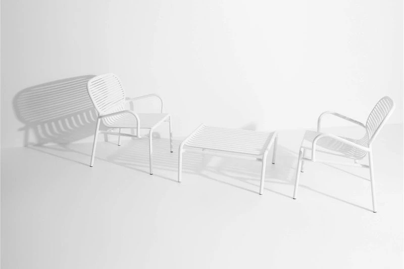 Muotoilijaduo BrichetZieglerin Petite Friturelle suunnitteleman Week-end-kokoelman puutarhakalusteet yhdistelevät erilaisia geometrisia muotoja käytännölliseen nykydesigniin. Alumiinista valmistetut kalusteet ovat rakenteeltaan sekä kevyitä että kestäviä, eikä niiden epoksimaalattu mattapinta säikähdä paahtavaa aurinkoa tai rankkasadetta. Monipuoliseen Week-end-sarjaan kuuluu monen kokoisia ja värisiä pöytiä, tuoleja ja penkkejä sekä suuriin puutarhoihin että pienille parvekkeille. Siron ulkomuotonsa ansiosta kalusteet sopivat myös sisätiloihin.