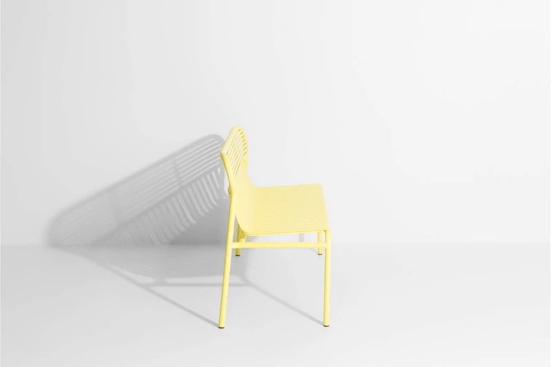 Muotoilijaduo BrichetZieglerin Petite Friturelle suunnitteleman Week-end-kokoelman puutarhakalusteet yhdistelevät erilaisia geometrisia muotoja käytännölliseen nykydesigniin. Alumiinista valmistetut kalusteet ovat rakenteeltaan sekä kevyitä että kestäviä, eikä niiden epoksimaalattu mattapinta säikähdä paahtavaa aurinkoa tai rankkasadetta. Monipuoliseen Week-end-sarjaan kuuluu monen kokoisia ja värisiä pöytiä, tuoleja ja penkkejä sekä suuriin puutarhoihin että pienille parvekkeille. Siron ulkomuotonsa ansiosta kalusteet sopivat myös sisätiloihin.