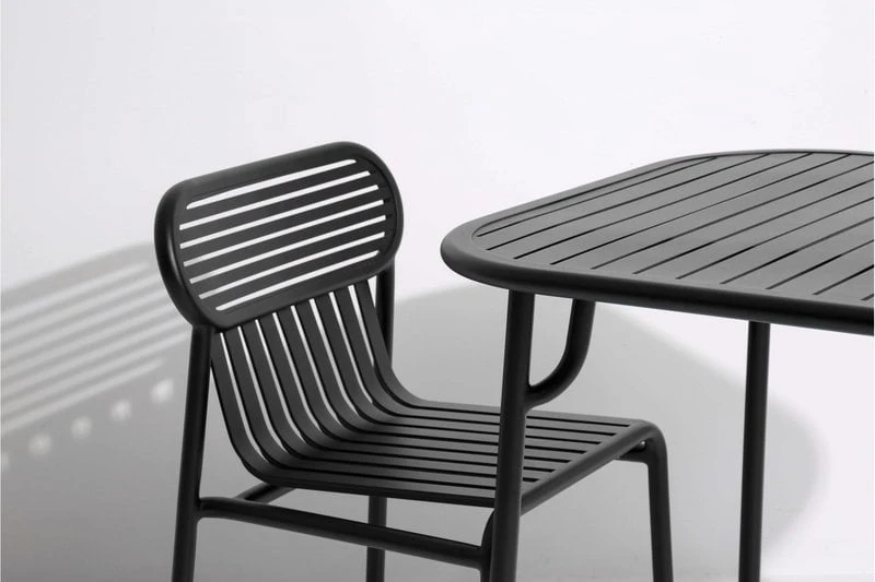 Muotoilijaduo BrichetZieglerin Petite Friturelle suunnitteleman Week-end-kokoelman puutarhakalusteet yhdistelevät erilaisia geometrisia muotoja käytännölliseen nykydesigniin. Alumiinista valmistetut kalusteet ovat rakenteeltaan sekä kevyitä että kestäviä, eikä niiden epoksimaalattu mattapinta säikähdä paahtavaa aurinkoa tai rankkasadetta. Monipuoliseen Week-end-sarjaan kuuluu monenkokoisia ja -värisiä pöytiä, tuoleja ja penkkejä sekä suuriin puutarhoihin että pienille parvekkeille. Siron ulkomuotonsa ansiosta kalusteet sopivat myös sisätiloihin.