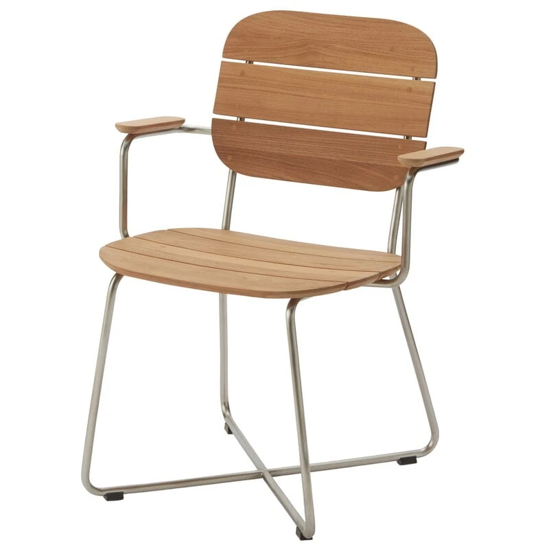 Skagerakin käsinojallinen Lilium-tuoli tarjoaa mukavan istumapaikan parvekkeella tai terassilla. Sen puiset käsinojat, kaartuva istuin ja aavistuksen joustava selkänoja takaavat miellyttävän istuma-asennon, joten puisella terassituolilla istuen voit viettää rattoisia kesäpäiviä hyvän ruoan ja seuran äärellä vaikka pitkälle iltaan.