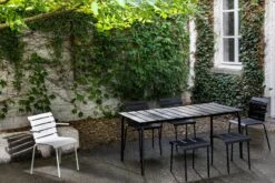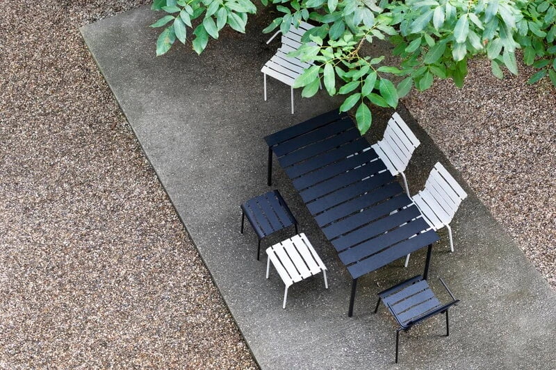 valerie objectsin Aligned-ruokapöydän näennäisen yksinkertainen ilme yllättää: epäsymmetriset, alumiinista valmistetut säleet antavat klassisen vähäeleiselle puutarhapöydälle täysin uudenlaisen persoonan. Tunnetun hollantilaissuunnittelija Maarten Baasin kekseliäs ja leikkisä kädenjälki on vahvasti esillä jokaisessa yksityiskohdassa – Aligned-pöytä on luotu täsmällisesti Baasin lyijykynäpiirroksen pohjalta. Kaunis ja kestävä ulkokäyttöön soveltuva ruokapöytä sopii niin puutarhaan kuin kesämökin terassillekin ja sen hurmaavan persoonallinen ilme saa suupielet kääntymään hymyyn vuodesta toiseen.