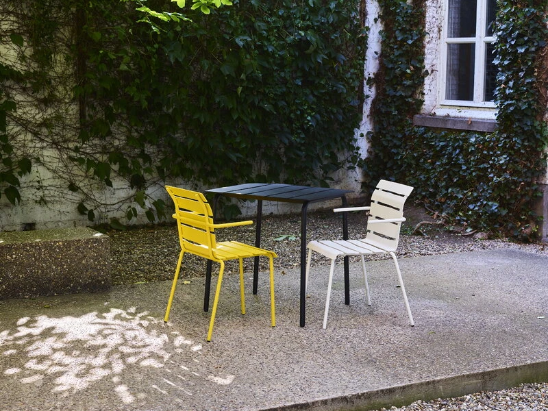 valerie objectsin Aligned-ruokapöydän näennäisen yksinkertainen ilme yllättää: epäsymmetriset, alumiinista valmistetut säleet antavat klassisen vähäeleiselle puutarhapöydälle täysin uudenlaisen persoonan. Tunnetun hollantilaissuunnittelija Maarten Baasin kekseliäs ja leikkisä kädenjälki on vahvasti esillä jokaisessa yksityiskohdassa – Aligned-pöytä on luotu täsmällisesti Baasin lyijykynäpiirroksen pohjalta. Kaunis ja kestävä ulkokäyttöön soveltuva ruokapöytä sopii niin puutarhaan kuin kesämökin terassillekin ja sen hurmaavan persoonallinen ilme saa suupielet kääntymään hymyyn vuodesta toiseen.